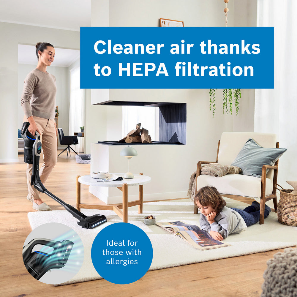 With Bosch’s MicroClean™ ring, you know when surfaces are truly clean. If the ring remains white, particles are still being vacuumed. Once it turns blue, rest assured that no more dust is left behind. This feature is ideal for hard-to-reach spaces, such as under furniture, and for maintaining the cleanliness of carpets and upholstery.